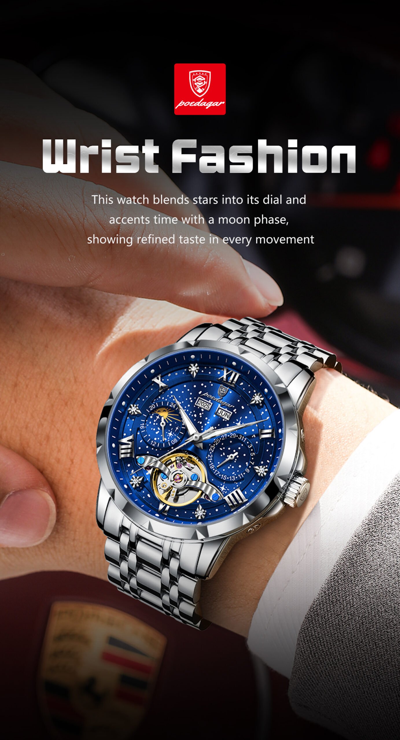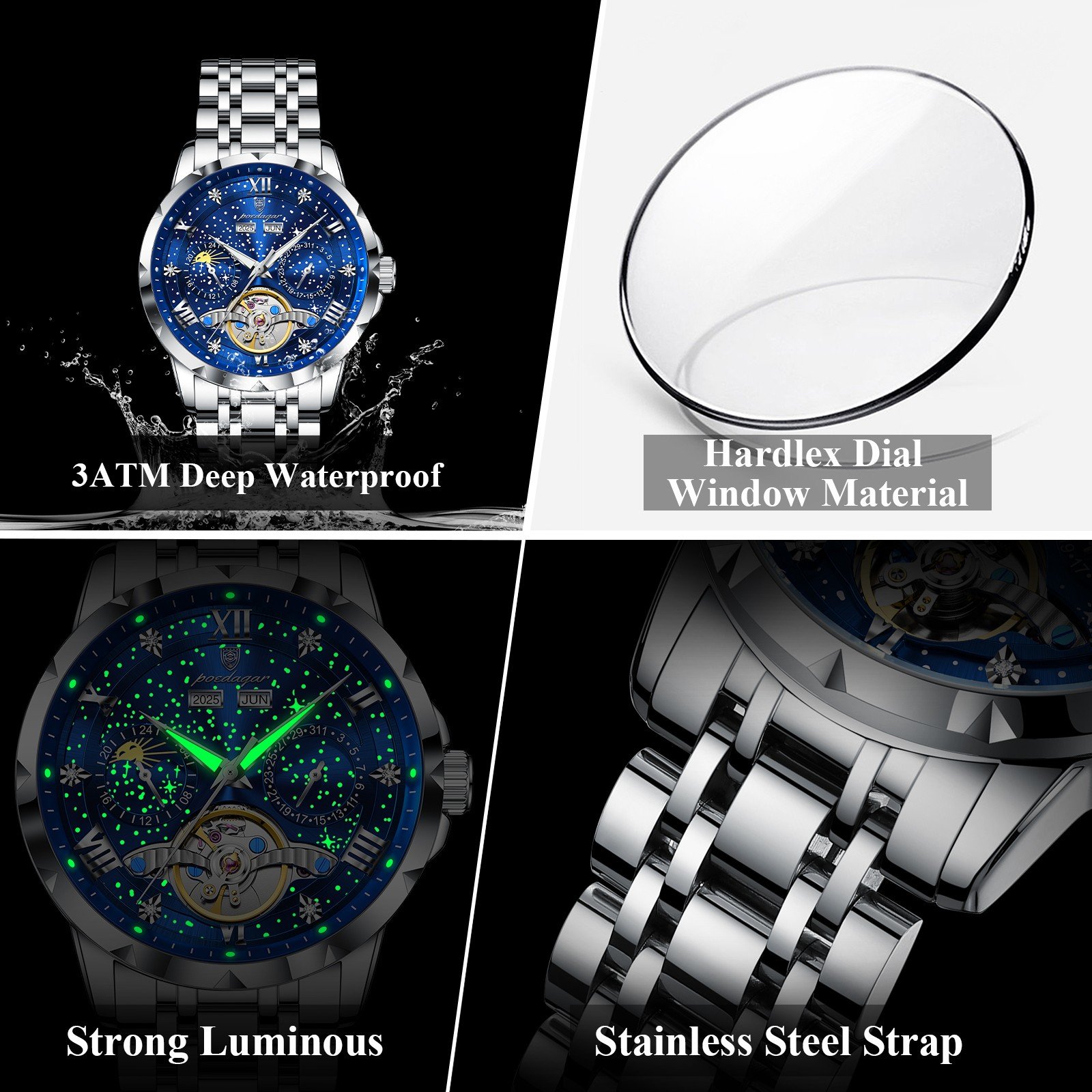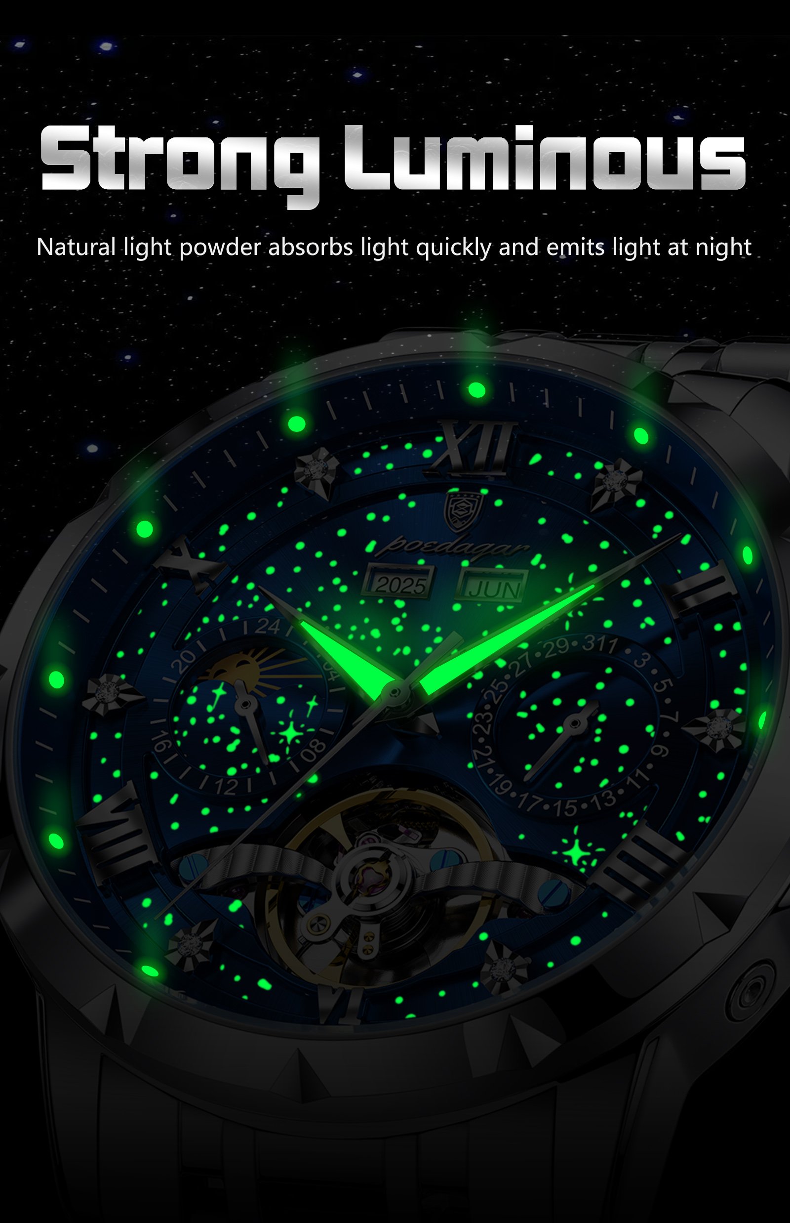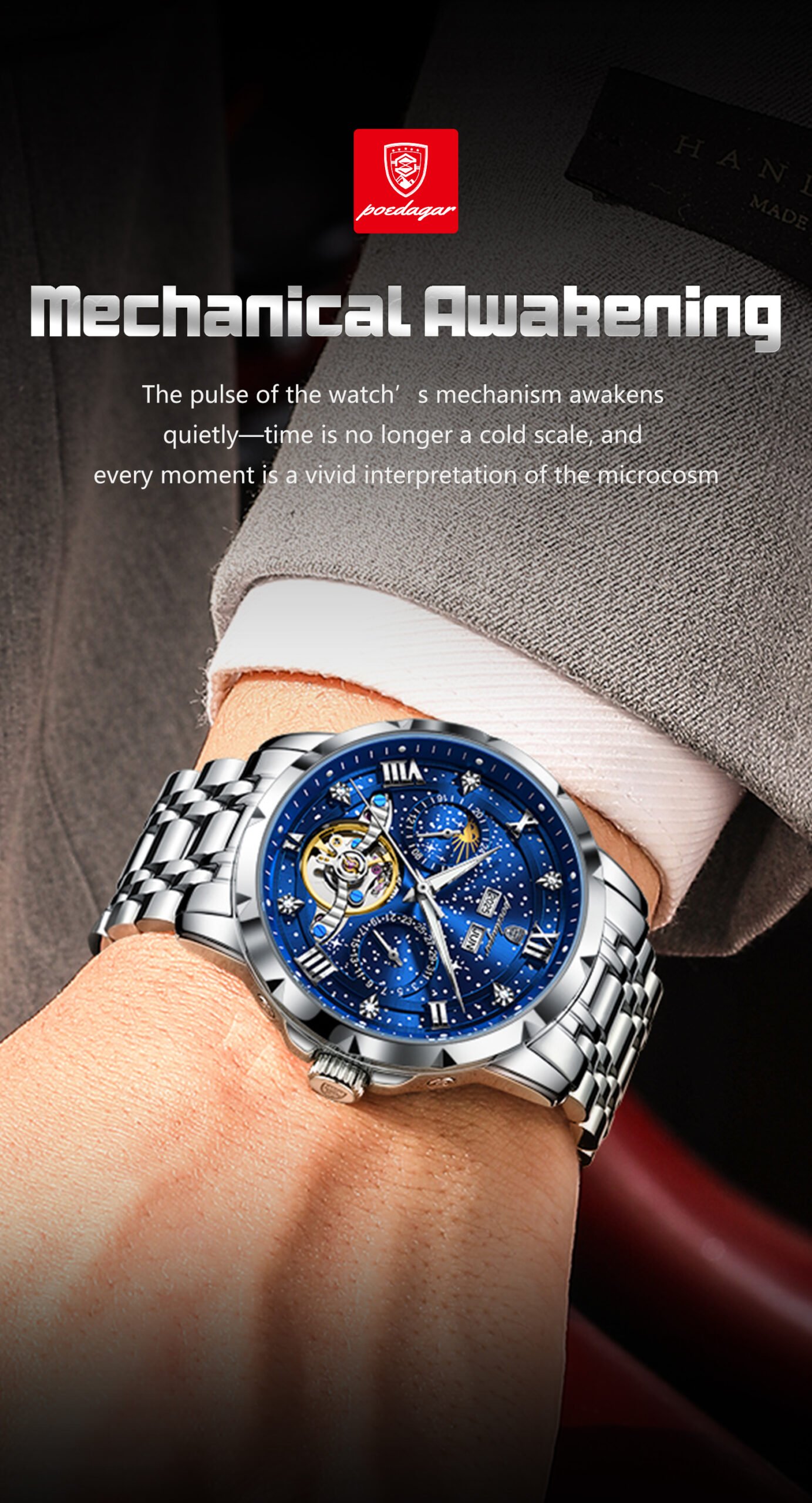 POEDAGAR 1420 Top Original Men Clock Automatic Mechanical Stainless Steel Men’s Watches Calendar Hollow Tourbillon Man Watch Male