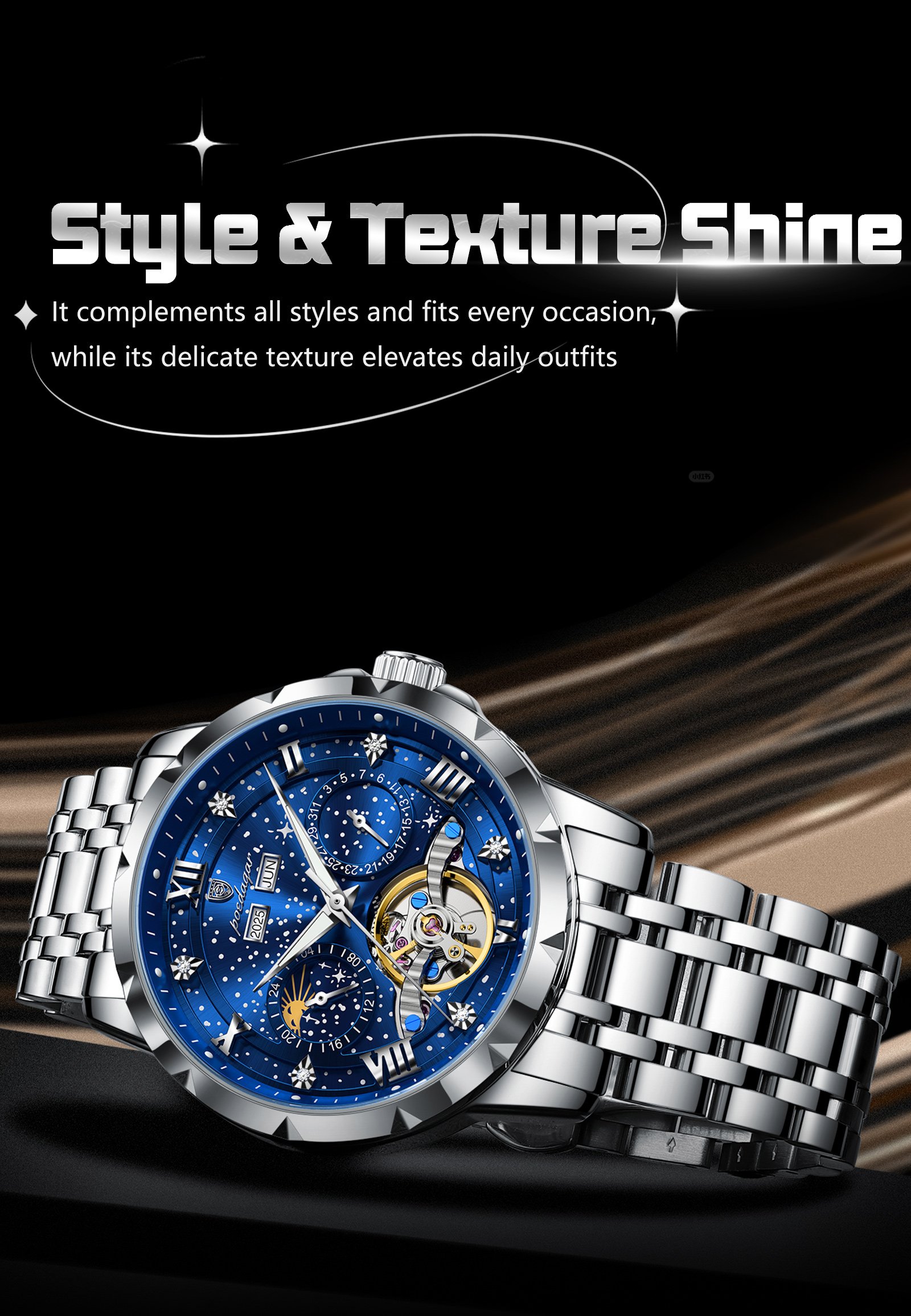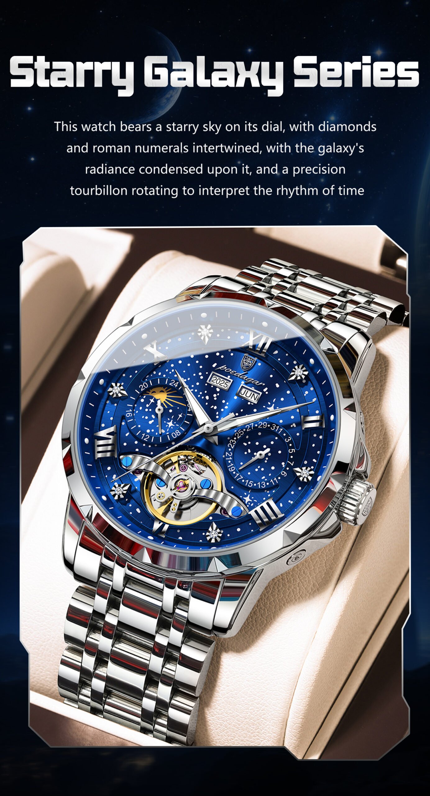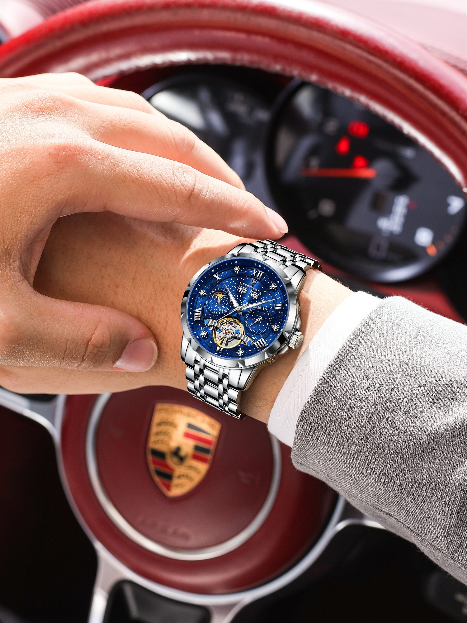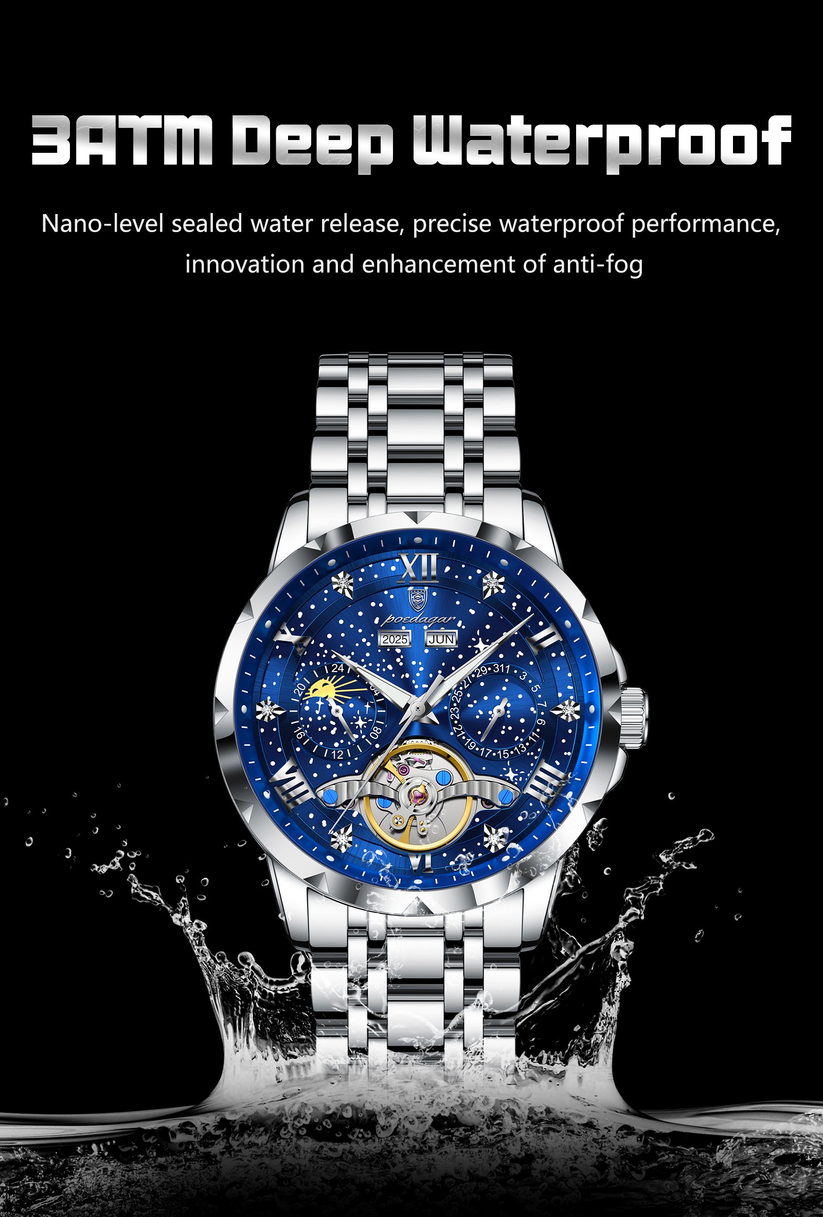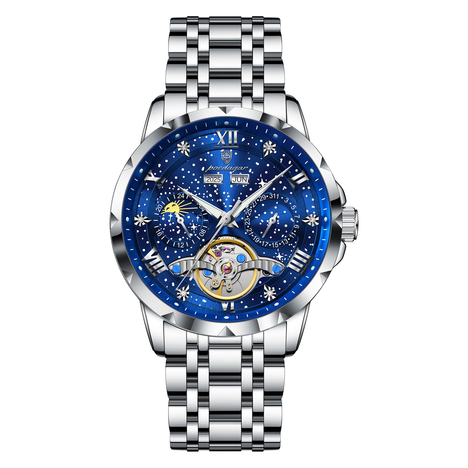 POEDAGAR 1420 Top Original Men Clock Automatic Mechanical Stainless Steel Men’s Watches Calendar Hollow Tourbillon Man Watch Male