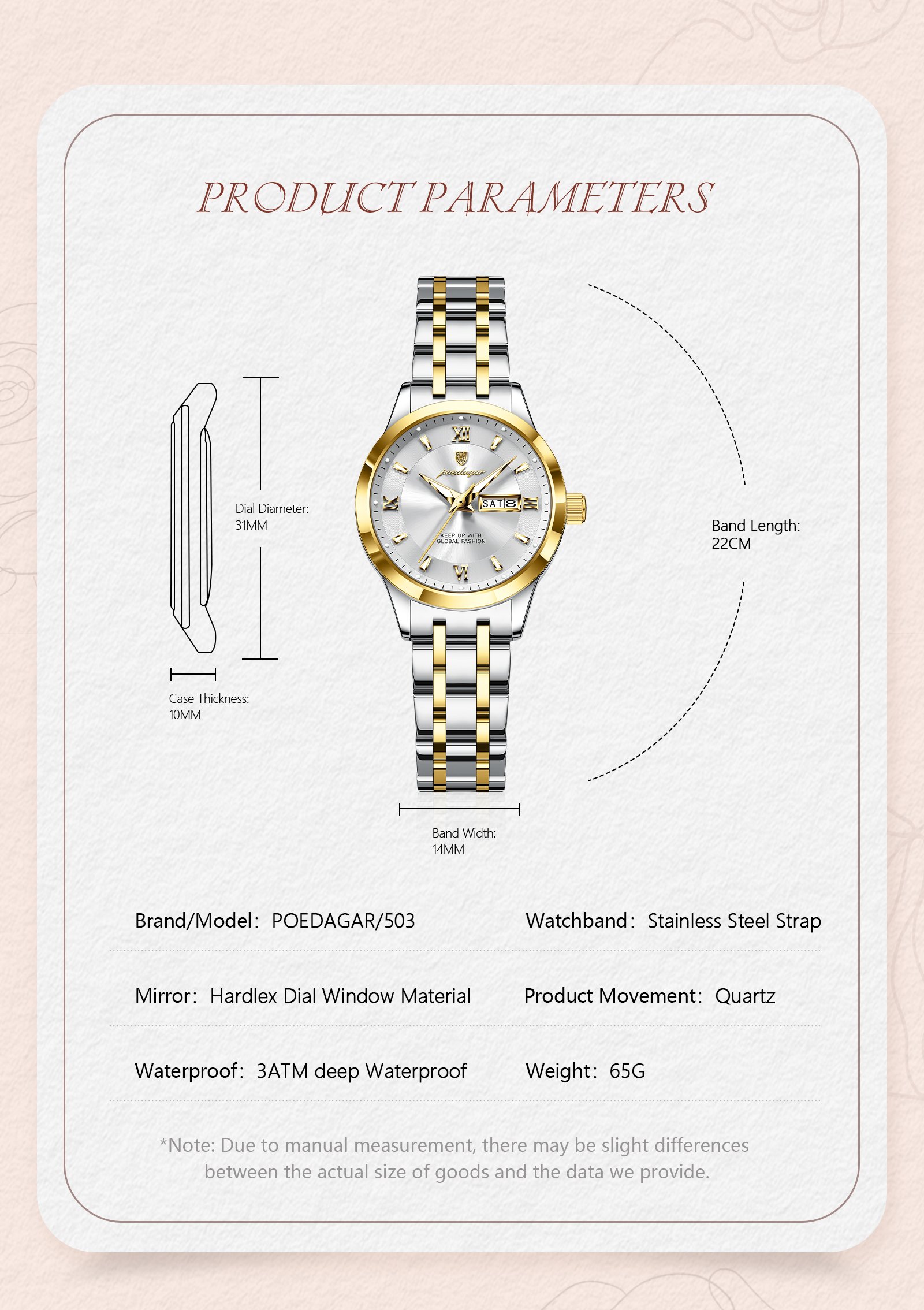POEDAGAR 503 Luxury Elegant Woman's Watches Luminous Waterproof Stainless Steel Ladies Wristwatch Quartz Week Date Women Watch Reloj