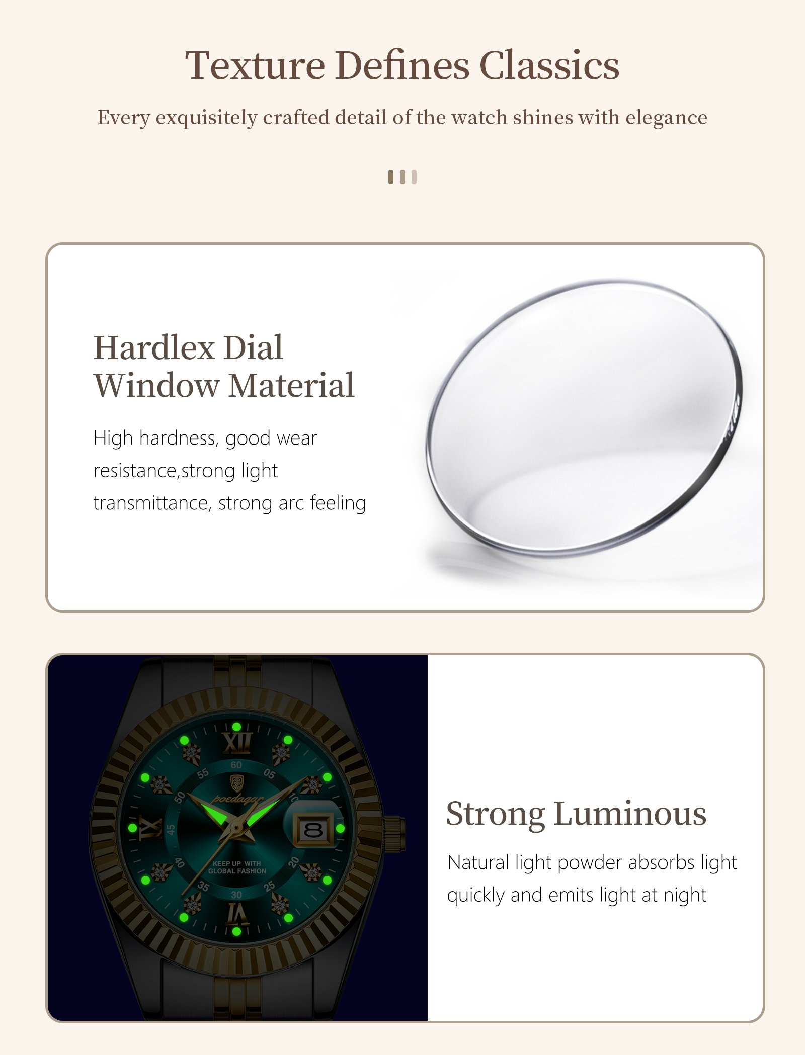 Every Poedagar watch is thoughtfully designed to blend classic elegance with modern trends. From durable stainless steel cases to finely-tuned quartz movements, our watches are built to last—and built to impress. Whether you're dressing for a boardroom, a night out, or your next adventure, there's a Poedagar timepiece made to complement your moment.